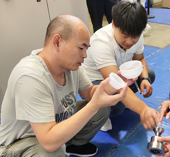 在旋杯拆裝環(huán)節(jié),售后服務(wù)部李經(jīng)理親自上陣,為學(xué)員們帶來了一場(chǎng)生動(dòng)的教學(xué)體驗(yàn)。他從RMB26靜電旋杯的設(shè)計(jì)特點(diǎn)講起,一步步引導(dǎo)大家了解旋杯的拆卸安裝,易損件的維護(hù)更換,直至旋杯的清洗處理等各個(gè)環(huán)節(jié)。 在李經(jīng)理的悉心指導(dǎo)下,與會(huì)人員認(rèn)真聆聽,積極互動(dòng),實(shí)地動(dòng)手實(shí)踐,逐步熟悉了產(chǎn)品結(jié)構(gòu)和各種零部件。這種面對(duì)面的交流學(xué)習(xí)方式讓學(xué)員們感覺受益匪淺,不僅鞏固了所學(xué)知識(shí),還進(jìn)一步加深了對(duì)培訓(xùn)內(nèi)容的認(rèn)識(shí)和理解。 04